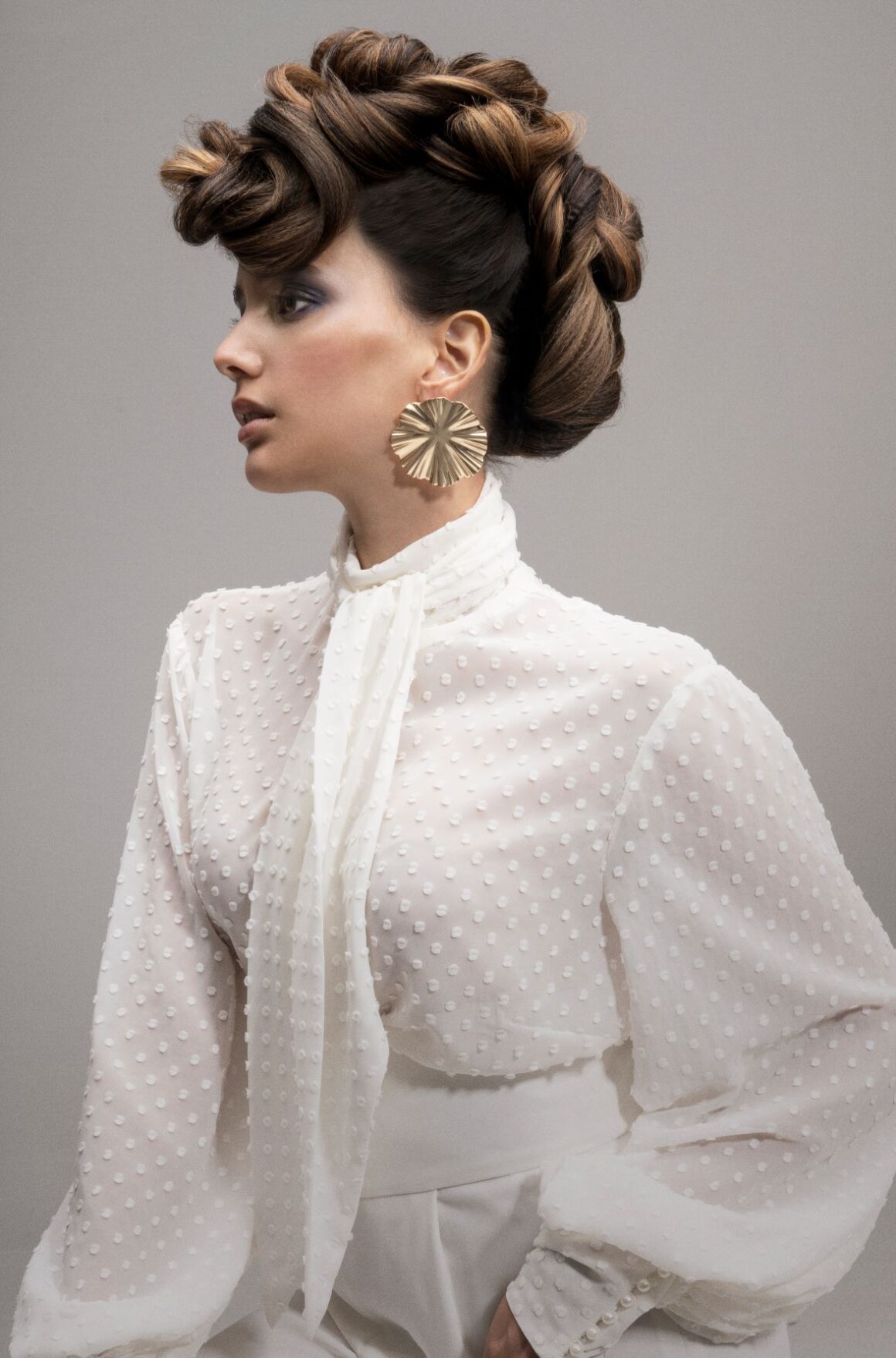Elegante e disinvolto, questo raccolto morbido lascia liberi due ciuffi sulla fronte. Per crearlo, i capelli sono stati precedentemente cotonati e lavorati a phon. L’hair look è dello spagnolo Juanmy Medialdea.