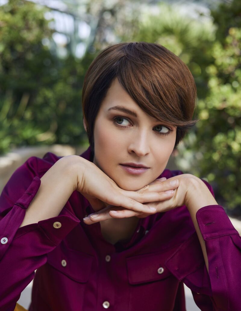 Capelli corti e frangia lunga pettinata su un lato, ovvero side fringe. Un look naturale sottolineato dalla scelta di un colore castano naturale, appena sfumato.