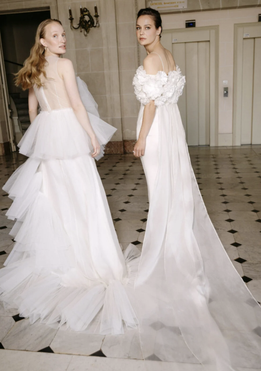 A caratterizzare gli abiti da sposa di Kaviar Gauche sono stati il morbido tulle, lo chiffon e la seta, tra trasparenze, tessuti impalpabili e lunghi strascichi di ispirazione tradizionale. Il tutto con un tocco contemporaneo, grazie a forme che sottolineavano le silhouette delle due attrici, lasciando scoperte non solo le spalle, ma anche ampie porzioni di schiena. Cornici ideali per le acconciature sciolte!