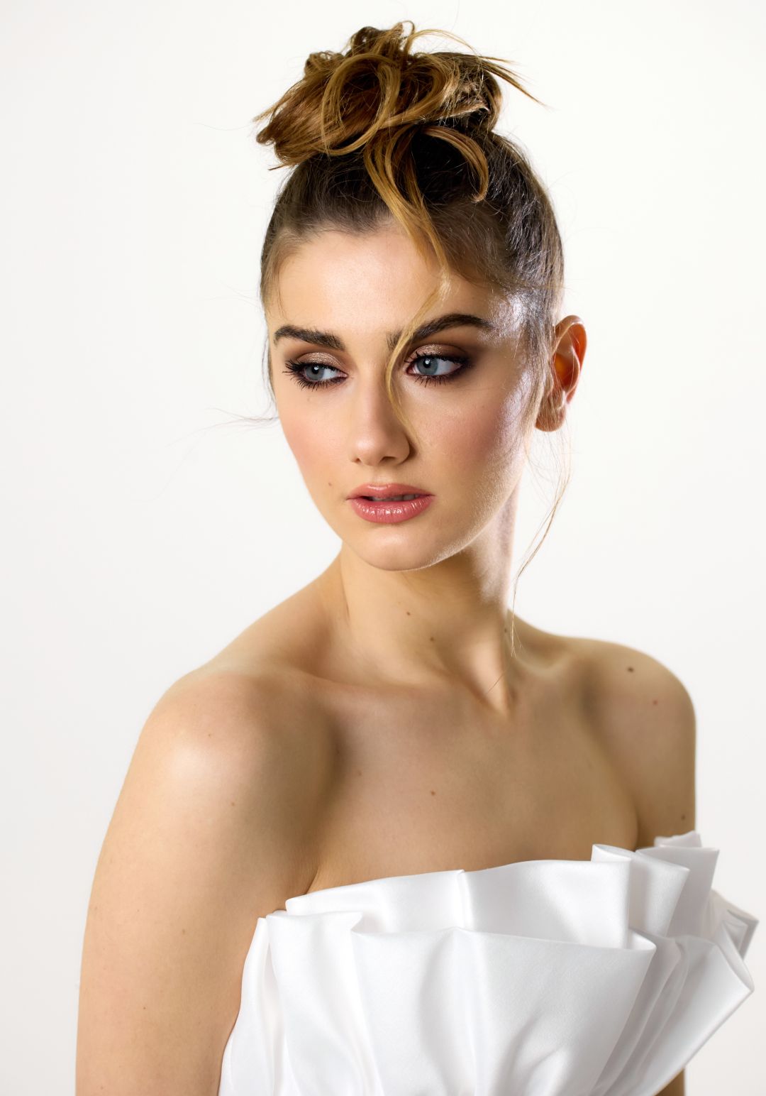 La sposa allegra, frizzante e giocosa si riconosce nel raccolto Pleasure. Un richiamo a Madonna negli anni ’80. Per la cerimonia sceglie un raccolto riccio con tulle: da notare come il volume nella parte frontale sia studiato per donare allo sguardo un’intensa sensualità.