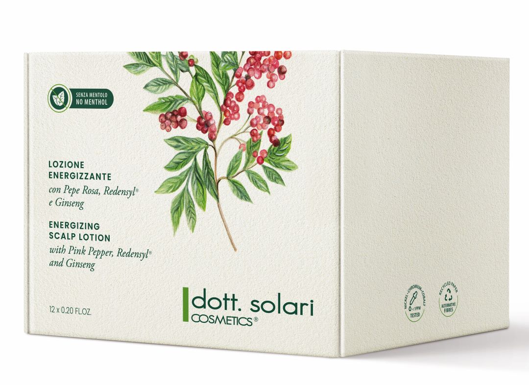 Phitocomplex Lozione energizzante senza mentolo di dott. solari cosmetics combina estratti vegetali rivitalizzanti, quali il pepe rosa e il ginseng, con il complesso Redensyl, ridensificante. Tonifica e rivitalizza il cuoio capelluto.