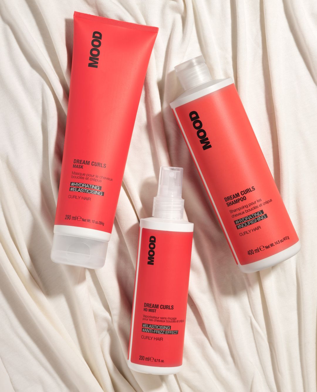 La linea Mood Dream Curls, con Shampoo, Mask e spray HD Mist, è ideale per tutte le tipologie di capello riccio e mosso. Grazie all'acqua di riso fermentata, garantisce texture definite, idratate e senza crespo, valorizzando la loro bellezza naturale.