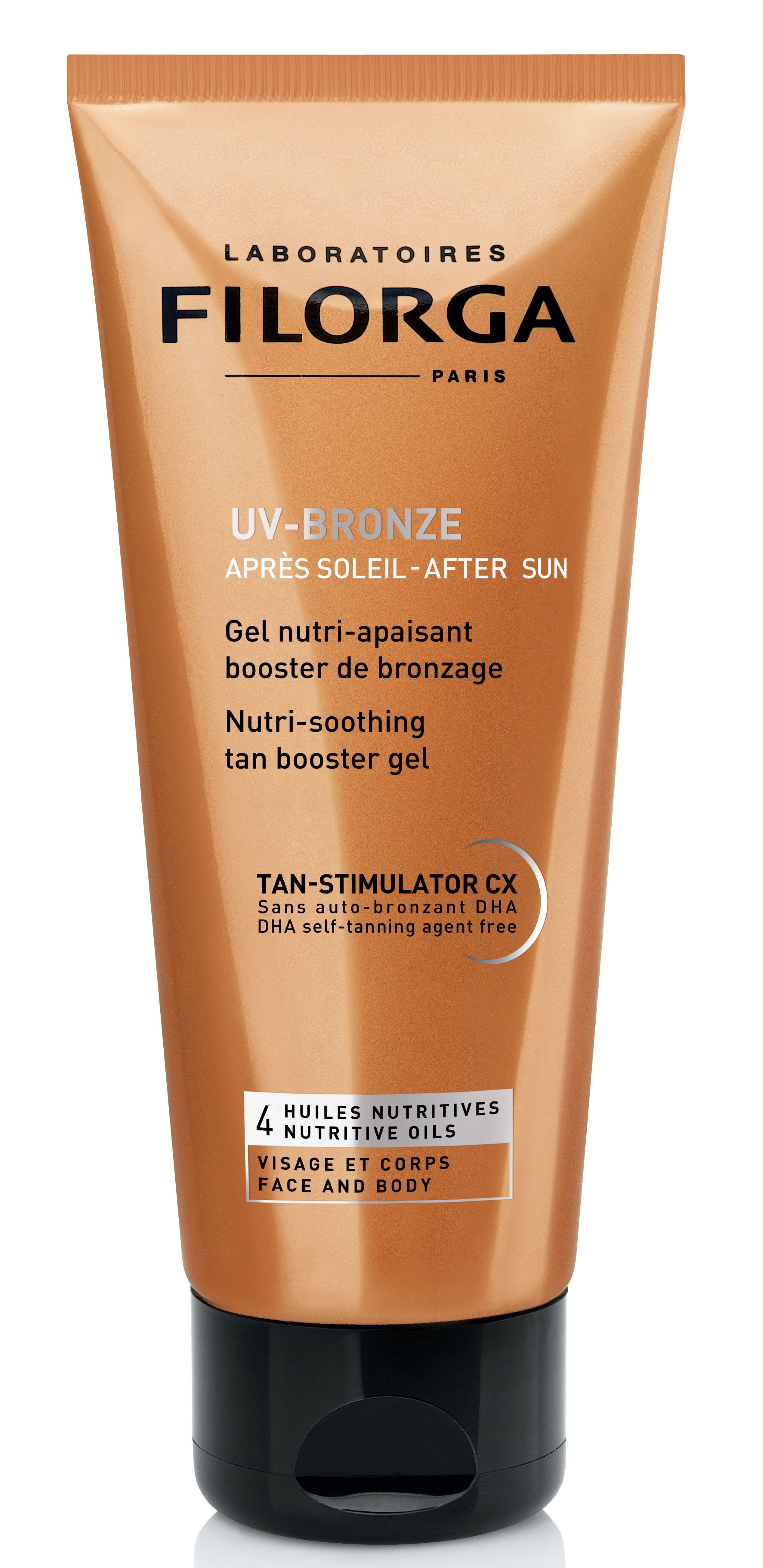 Uv-Bronze After Sun di Filorga è un gel attivatore e prolungatore di abbronzatura che si trasforma in olio a contatto con la pelle, per lenirla istantaneamente e sublimarla, senza ungere. Nel cuore della formula ci sono quattro oli pro-age: argan, albicocca, mandorle dolci e avocado. Nutrono la pelle in associazione all’acido ialuronico, idratandola in profondità.