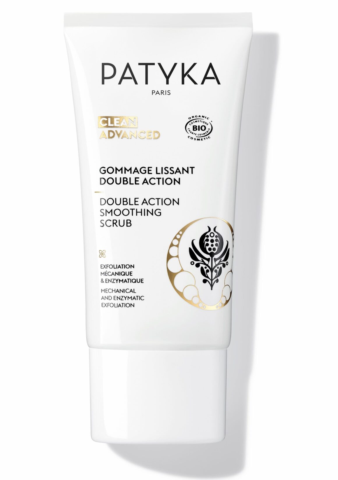 Scrub Lisciante doppia azione di Patyka è un trattamento viso perfezionatore che preserva la luminosità e leviga la grana della pelle e le rughe. Agisce sia con esfoliazione meccanica che enzimatica. Contiene un complesso con 5 acidi naturali della frutta e microsfere di cera di jojoba.