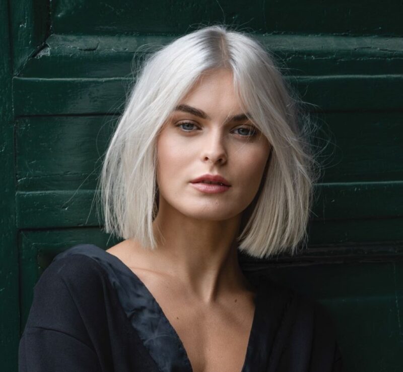 Il taglio medio pari con la riga centrale dei saloni Jurvedha è la proposta più semplice e allo stesso tempo poliedrica della stagione. Pettinato liscio, mosso o all’indietro diventa espressione dello stato d’animo di chi lo porta. Il colore biondo ghiaccio conferma l’eleganza fluida e naturale del look.