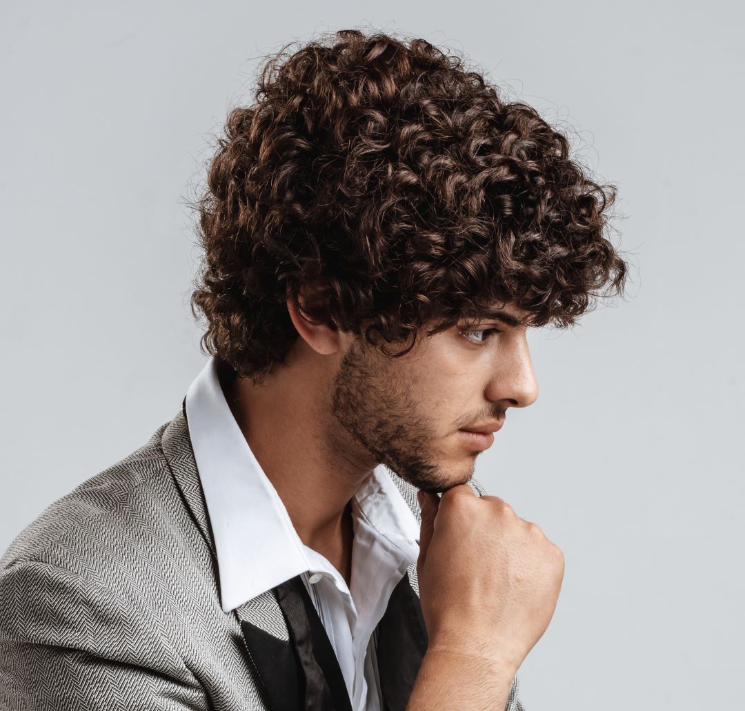 Più lungo in cima e rasato sulle tempie, il bald curl cut proposto dai saloni Sanrizz è deciso, ma privo di contrasti netti. La rasatura, infatti, non percorre la testa intera, ma si ferma a un piccolo triangolo tra la tempia e l’orecchio, allungandosi in una basetta corta. Il risultato è un look da dandy 2.0.