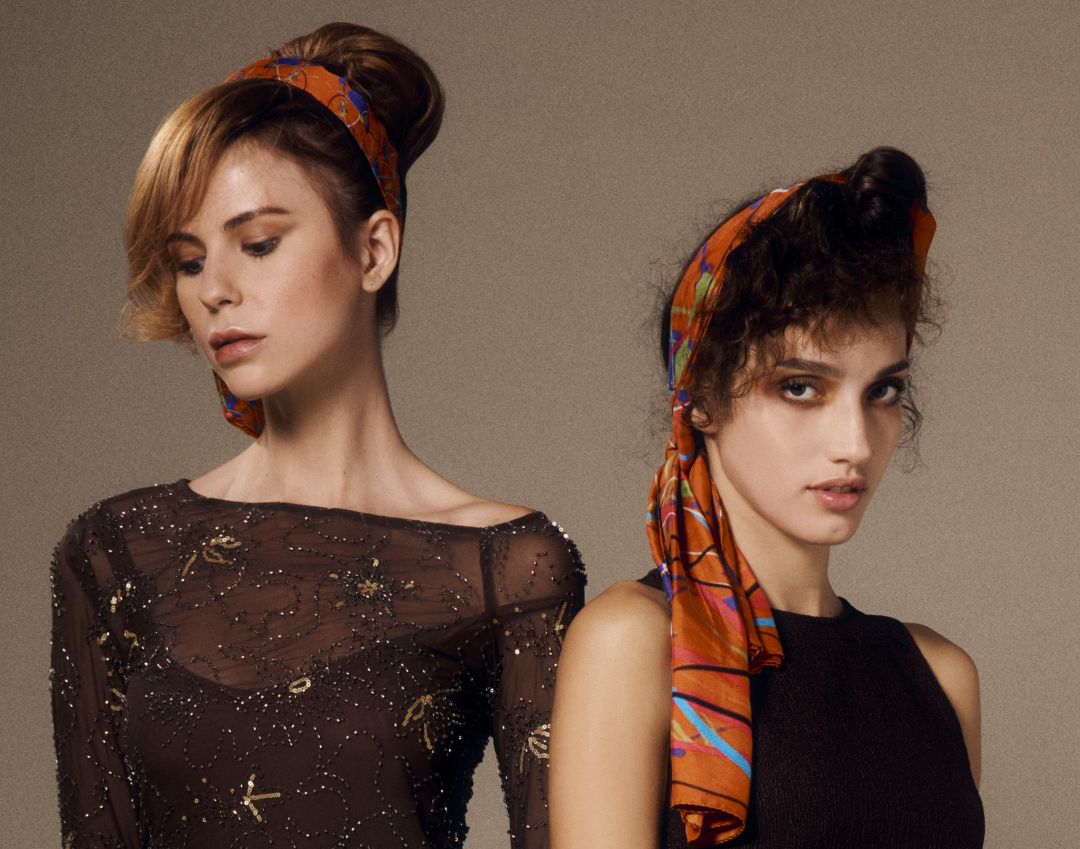 Le acconciature raccolte delle feste 2025 inaugurano due novità: il ritorno del foulard e le fasce luminose di capelli sulla fronte, scollegate dal resto della capigliatura come se fossero un accessorio a sé. Due dettagli semplici, ma d’effetto, entrambi all’insegna della luminosità della seta.