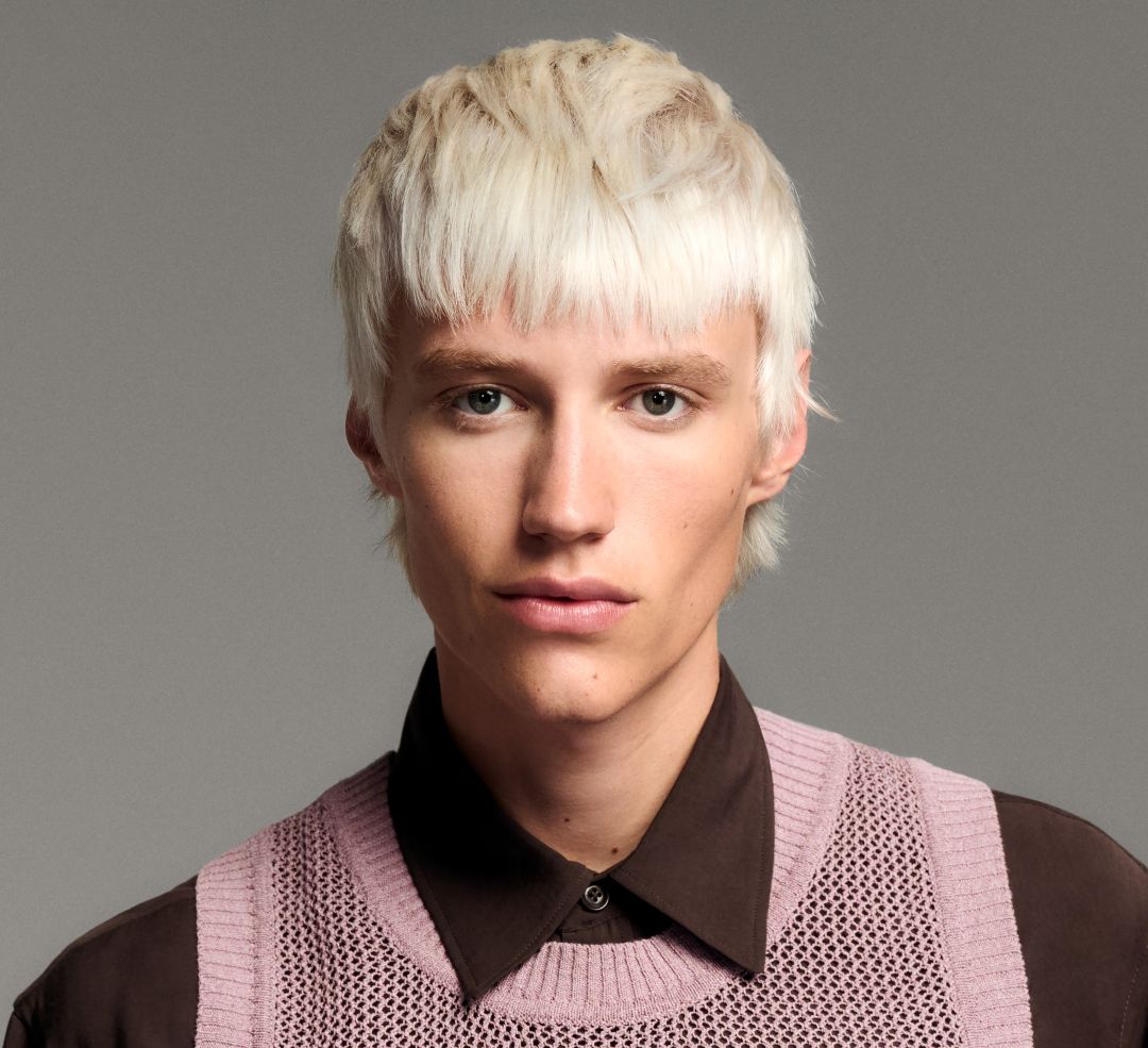 È la versione strutturata e meno ‘bowl’ del tradizionale taglio di capelli uomo anni 60, quello, per intenderci, che portavano i Beatles. La frangia, piena e scalata solo sulla sommità, ha linee irregolari e sfilate che sfiorano le sopracciglia.